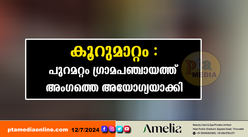 പത്തനംതിട്ട – പുറമറ്റം ഗ്രാമപഞ്ചായത്ത് അഞ്ചാം വാർഡ് അംഗം സൗമ്യ വിജയനെ സംസ്ഥാന തിരഞ്ഞെടുപ്പ് കമ്മീഷണർ എ.ഷാജഹാൻ കൂറുമാറ്റനിരോധന നിയമപ്രകാരം അയോഗ്യയാക്കി. 2022 ജൂലൈ 25 ന് നടന്ന വൈസ് പ്രസിഡന്റ് തിരഞ്ഞെടുപ്പിൽ വിപ്പ് ലംഘിച്ച് വോട്ട് ചെയ്തതിനാലാണ് കമ്മീഷന്റെ നടപടി. 13-ാം വാർഡ് അംഗം ഷിജു പി. കുരുവിള നൽകിയ പരാതിയിലാണ് കമ്മീഷന്റെ ഉത്തരവ്. നിലവിൽ അംഗമായി തുടരുന്നതിനും 2024 ജൂലൈ ഒൻപത് മുതൽ ആറ് വർഷത്തേക്ക് ഏതെങ്കിലും തദ്ദേശസ്ഥാപനങ്ങളിലേയ്ക്കുള്ള തിരഞ്ഞെടുപ്പിൽ മത്സരിക്കുന്നതിനും കമ്മീഷൻ അയോഗ്യത പ്രഖ്യാപിച്ചിട്ടുണ്ട്.