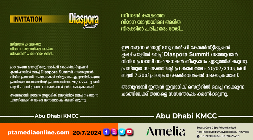 അബുദാബി : അബുദാബി കെഎംസിസിയുടെ നേതൃത്വത്തിൽ ഓഗസ്റ്റ് 8നു ഡൽഹിയിൽ വെച്ച് സംഘടിപ്പിക്കുന്ന ഡയസ്പോറ സമ്മിറ്റ് ഇന്റെ പ്രചാരണ കൺവൻഷൻ ഇന്ന് (ശനി 20/07/2024) രാത്രി 7 .30 നു അബുദാബി ഇന്ത്യൻ ഇസ്ലാമിക് സെന്ററിൽ വെച്ച് നടക്കും.