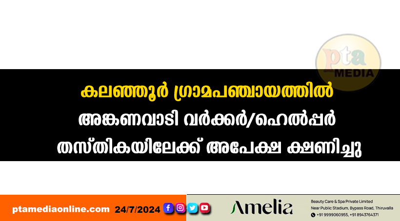 പറക്കോട് ശിശു വികസന പദ്ധതി ഓഫീസ് പരിധിയിലെ കലഞ്ഞൂർ ഗ്രാമപഞ്ചായത്തിൽ അങ്കണവാടി കേന്ദ്രങ്ങളിൽ നിലവിൽ ഉണ്ടാകാൻ സാധ്യതയുള്ള അങ്കണവാടി വർക്കർമാരുടെയും ഹെൽപ്പർമാരുടെയും ഒഴിവുകളിലേക്ക് സ്ഥിരനിയമനത്തിനു സെലക്ഷൻ ലിസ്റ്റ് പ്രസിദ്ധീകരിക്കുന്നതിന് കലഞ്ഞൂർ പഞ്ചായത്ത് പരിധിയിൽ സ്ഥിര താമസമാക്കിയിട്ടുള്ള വനിതകളിൽ നിന്നും അപേക്ഷ ക്ഷണിച്ചു.