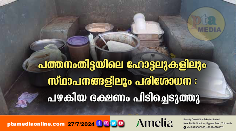 പത്തനംതിട്ട: നഗരത്തിലെ വിവിധ ഹോട്ടലുകളിലും സ്ഥാപനങ്ങളിലും നഗരസഭ ആരോഗ്യ വിഭാഗം പരിശോധന നടത്തി. പഴകിയ ഭക്ഷ്യവസ്തുക്കളും നിരോധിത പ്ലാസ്റ്റിക് ഉല്പ്പന്നങ്ങളും പുകയില ഉല്പ്പന്നങ്ങളും പിടിച്ചെടുത്തു.
