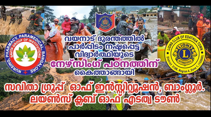 ഈ വർഷം അഡ്മിഷൻ എടുക്കാൻ മറ്റൊരു കോളജിൽ അഡ്മിഷൻ എടുക്കാൻ തീരുമാനിച്ച പ്രകാരം ആണ് സവിതാ ഗ്രൂപ്പ് ഓഫ് ഇൻസ്റ്റിറ്റ്യൂഷനിലേക്ക് അപേക്ഷ നല്കിയത്. അങ്ങനെയിരിക്കുമ്പോൾ ആണ് വയനാട് പ്രകൃതി ദുരന്തത്തിൽ വീടും പണവും എല്ലാം നഷ്ടപെടുന്നത്.നേഴ്സിങ്ങ് പഠനം അസാധ്യമെന്ന് കരുതി നിരാശയിൽ കഴിഞ്ഞിരുന്ന അശ്വിന്റെ അവസ്ഥയറിഞ്ഞാണ് സുമനസ്സുകൾ കൈത്താങ്ങായി എത്തിയത്. സവിതാ ഗ്രൂപ്പ് ഓഫ് ഇൻസ്റ്റിറ്റ്യൂഷൻ ഫീസ് പൂർണ്ണമായും ഇളവ് ചെയ്തു. താമസ സൗകര്യത്തിനും ഭക്ഷണത്തിനും മറ്റ് ചെലവുകൾക്കുമായി ഉള്ള തുക എടത്വ ടൗൺ ലയൺസ് ക്ലബും എച്ച്ആർസി യും ചേർന്ന് നല്കും.സേവ് വയനാട് പ്രോജക്ടിന് രെഞ്ചു ഏബ്രഹാം കല്ലുപുരയ്ക്ക്ൽ ആദ്യ സംഭാവന നല്കി.സെപ്റ്റംബർ 5ന് കോളജിൽ പഠനത്തിനായി അശ്വിൻ പ്രവേശിക്കും.