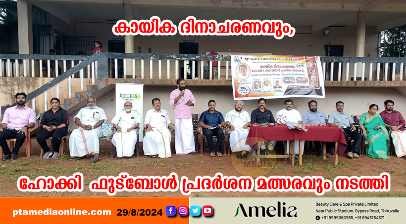 തിരുവല്ല : വൈ.എം.സി.എ സബ് – റീജണിൻ്റെ നേതൃത്വത്തിൽ കായിക ദിനാചരണവും ഹോക്കി – ഫുട്ബോൾ പ്രദർശന മത്സരവും മാർത്തോമ്മാ കോളേജ് ഗ്രൗണ്ടിൽ നടത്തി. വൈ.എം.സി.എ സബ് – റിജൻ ചെയർമാൻ ജോജി പി. തോമസ് അദ്ധ്യക്ഷത വഹിച്ചു. ജില്ലാ ഒളിമ്പിംക്സ് അസോസിയേഷൻ പ്രസിഡൻ്റ് അഡ്വ. കെ. പ്രകാശ് ബാബു ഉദ്ഘാടനം ചെയ്തു. മുൻ ഇന്ത്യൻ ഫുട്ബോൾ ഗോൾ കീപ്പർ കെ.ടി ചാക്കോ, കേരളാ ഫുട്ബോൾ അസോസിയേഷൻ ട്രഷറർ ഡോ. റെജിന്നോൾസ് വർഗീസ്, സബ് – റീജൻ ജനറൽ കൺവീനർ സുനിൽ മറ്റത്ത്, സബ് റീജൺ സ്പോർട്സ് ആൻ്റ് ഗെയിംസ് കൺവീനർ കുര്യൻ ചെറിയാൻ, സബ് – റീജൻ മുൻ ചെയർമാൻന്മാരായ ജൂബിൻ ജോൺ, അഡ്വ. എം.ബി നൈനാൻ, ജോ ഇലഞ്ഞിമൂട്ടിൽ, തിരുവല്ല വൈ.എം.സി.എ പ്രസിഡൻ്റ് പ്രൊഫ. കുര്യൻ ജോൺ, ഫൊക്കാനാ സീനിയർ വൈസ് ചെയർപേഴ്സൺ ലീലാ മാരേട്ട്, വർഗീസ് മാത്യു, ബിജു തുടങ്ങിപ്പറമ്പിൽ, ഡാലി ജോർജ്, സ്റ്റീവ് ബെൻ ഫിലിപ്പ് എന്നിവർ പ്രസംഗിച്ചു. കെ.ടി ചാക്കോ, ദേശീയ ഹോക്കി താരം അജ്ഞലി കൃഷ്ണൻ, ഹോക്കി സംസ്ഥാന താരങ്ങളായ സോനാ മോൾ എൽദോ, വൈഗാ പ്രസാദ് എന്നിവരെ ആദരിച്ചു. ഹോക്കി – ഫുട്ബോൾ പ്രദർശന മത്സരവും നടന്നു. കായിക താരങ്ങൾക്ക് ഹോക്കി സ്റ്റിക്ക്, ഫുട്ബോൾ എന്നിവ നൽകി.