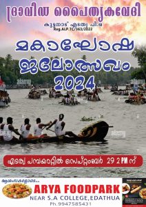 എടത്വാ : ദ്രാവിഡ പൈതൃക വേദിയുടെ ആഭിമുഖ്യത്തിൽ സെപ്റ്റംബർ 29ന് 2 മണിക്ക് എടത്വായിൽ നടത്തപ്പെടുന്ന മൂന്നാമത് മകം ജലോത്സവത്തിന്റെ സ്വാഗത സംഘം ഓഫീസ് എടത്വാ സെന്റ് അലോഷ്യസ് കോളേ ജിന് സമീപം തുണ്ടിപറമ്പിൽ ബിൽഡിങ്സിൽ ലയൺസ് ക്ലബ് ഓഫ് എടത്വാ ടൗൺ പ്രസിഡന്റ് ഡോ ജോൺസൺ വി ഇടിക്കുള ഉദ്ഘാടനം ചെയ്തു.പ്രസിഡന്റ് പി എം ഉത്തമൻ അധ്യക്ഷത വഹിച്ചു.വാർഡ് മെമ്പർ ബിജു മുളപ്പഞ്ചേരിൽ, ദ്രാവിഡ പൈതൃക വേദി ജനറൽ സെക്രട്ടറി ജി ജയചന്ദ്രൻ ,രക്ഷാധി കാരി എ ജെ കുഞ്ഞുമോൻ,കെകെ സുധീർ,കെസി സന്തോഷ്, സി എംകൃഷ്ണൻ, ഷാജി കരുവടി പച്ച, ടി. കെ സതീഷ്കുമാർ,സാബു പൂവക്കാട് എന്നിവർ പ്രസംഗിച്ചു,