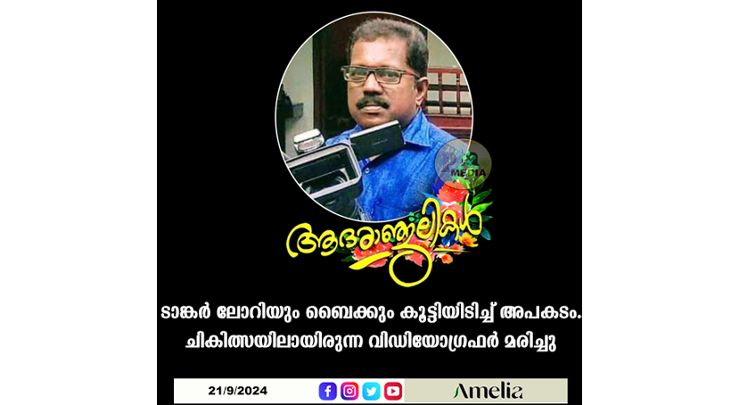 ടാങ്കർ ലോറിയും ബൈക്കും കൂട്ടിയിടിച്ച് അപകടം..ചികിത്സയിലായിരുന്ന വിഡിയോഗ്രഫർ മരിച്ചു