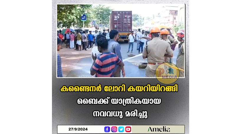 തിരുവനന്തപുരം: ദേശീയപാതയിൽ ആറ്റിങ്ങൽ മാമത്ത് കണ്ടെയ്നർ ലോറി കയറിയിറങ്ങി ബൈക്ക് യാത്രികയായ അഭിഭാഷികയ്ക്ക് ദാരുണാന്ത്യം. കൊല്ലം കൊട്ടറ സ്വദേശിനി കൃപ മുകുന്ദൻ (29) ആണ് മരണപ്പെട്ടത്. ഇന്ന് വൈകിട്ട് നാലരയോടെ ദേശീയ പാതയിൽ ആറ്റിങ്ങൽ മാമത്താണ് അപകടം. ഭർത്താവ് കൊല്ലം പൂയപ്പള്ളി സ്വദേശി അഖിൽ ജിത്തുമൊത്ത് ബൈക്കിൽ യാത്ര ചെയ്തു വരവേ കണ്ടെയ്നർ ലോറി ബൈക്കിന് പുറകിൽ ഇടിക്കുകയും റോഡിലേക്ക് വീണ കൃപയുടെ തലയിലൂടെ ലോറി കയറി ഇറങ്ങുകയുമായിരുന്നു.