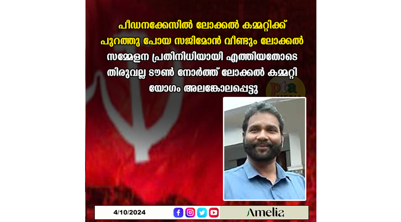 തിരുവല്ല: പീഡനക്കേസില് പ്രതി ചേര്ക്കപ്പെടുകയും അതിനാല് തന്നെ സി പിഎം ലോക്കല് കമ്മിറ്റിയില് നിന്നും പുറത്താക്കപ്പെട്ട സി.സി. സജിമോനെ ബ്രാഞ്ച് സമ്മേളനത്തില് ലോക്കല് സമ്മേളന പ്രതിനിധിയായി തെരഞ്ഞെടുക്കപ്പെട്ടതിനെ ചൊല്ലി ഇരുവിഭാഗങ്ങള് തമ്മില് ഉണ്ടായ വാക്കേറ്റത്തെ തുടര്ന്ന് സിപിഎം ലോക്കല് കമ്മിറ്റി യോഗം അലങ്കോലപ്പെട്ടു. വ്യാഴാഴ്ച വൈകിട്ട് ചേര്ന്ന ടൗണ് നോര്ത്ത് ലോക്കല് കമ്മിറ്റിയാണ് അലങ്കോലപ്പെട്ടത്.