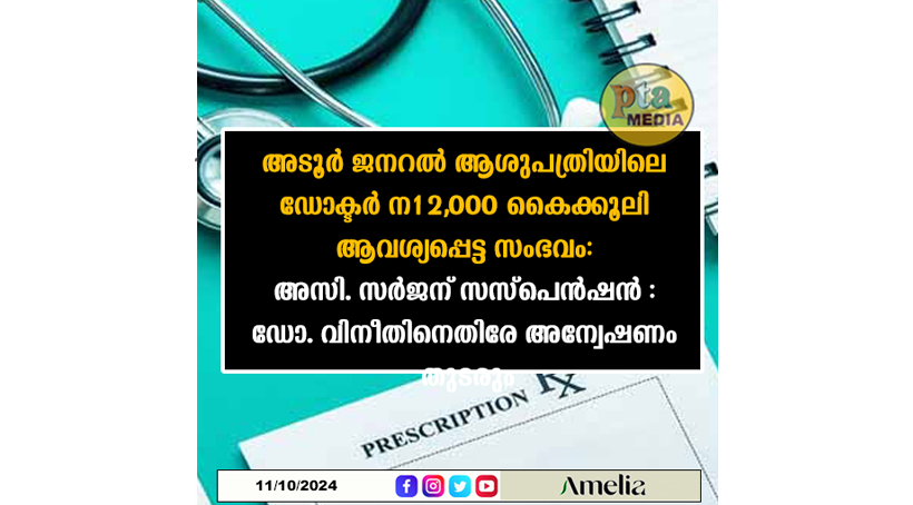 അടൂര്: ജനറല് ആശുപത്രിയില് പുറത്തെ തടിപ്പ് നീക്കുന്നതിന് ശസ്ത്രക്രിയയ്ക്ക് ചെന്ന രോഗിയോട് 12,000 രൂപ കൈക്കൂലി ആവശ്യപ്പെടുന്ന ശബ്ദരേഖ പുറത്ത് വന്നതിനെ തുടര്ന്ന് നടത്തിയ അന്വേഷണ റിപ്പോര്ട്ടിന്റെ അടിസ്ഥാനത്തില് ഡോക്ടര്ക്ക് സസ്പെന്ഷന്. അസിസ്റ്റന്റ് സര്ജന് ഡോ. വിനീതിനെയാണ് ജില്ലാ മെഡിക്കല് ഓഫീസറുടെ റിപ്പോര്ട്ടിന്റെ അടിസ്ഥാനത്തില് ആരോഗ്യവകുപ്പ് ഡയറക്ടര് സസ്പെന്ഡ് ചെയ്തത്. ശബ്ദരേഖ പുറത്തുവന്നതോടെ വലിയ പ്രതിഷേധമാണ് ആശുപത്രിയില് ഉണ്ടായത്. വിജിലന്സും പ്രാഥമികാന്വേഷണം നടത്തിയിരുന്നു.
