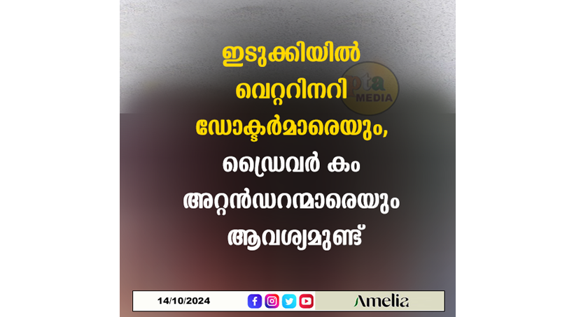 ഇടുക്കി – ദേവികുളം, അഴുത, അടിമാലി , തൊടുപുഴ, ഇളംദേശം ബ്ലോക്കുകളിലെ മൊബൈൽ വെറ്ററിനറി യൂണിറ്റിലേക്ക് ബി വി എസ് സി & എ എച്ച് യോഗ്യതയും വെറ്ററിനറി കൗൺസിൽ രജിസ്ട്രേഷനുമുള്ള വെറ്ററിനറി ഡോക്ടർമാരെ 90 ദിവസത്തേക്ക് കരാർ അടിസ്ഥാനത്തിൽ നിയമിക്കുന്നു. നിശ്ചിത യോഗ്യതയുള്ള വെറ്ററിനറി ബിരുദധാരികൾ ഒക്ടോബർ 17 വ്യാഴാഴ്ച രാവിലെ 11 നും (ദേവികുളം, അഴുത) രാവിലെ 12 ന് (അടിമാലി , തൊടുപുഴ, ഇളംദേശം) ബയോഡേറ്റ, വിദ്യാഭ്യാസ യോഗ്യത തെളിയിക്കുന്ന സർട്ടിഫിക്കറ്റ്, പ്രവൃത്തിപരിചയം എന്നിവ തെളിയിക്കുന്ന സർട്ടിഫിക്കറ്റ്, വെറ്ററിനറി കൗൺസിൽ രജിസ്ട്രേഷൻ സർട്ടിഫിക്കേറ്റ് , ആധാർ കാർഡ് എന്നിവയും പകർപ്പുകളും സഹിതം തൊടുപുഴ മങ്ങാട്ടുകവലയിൽ പ്രവർത്തിക്കുന്ന ജില്ലാ മൃഗസംരക്ഷണ ഓഫീസിൽ വാക്ക് ഇൻ ഇന്റർവ്യൂവിന് ഹാജരാകേണ്ടതാണ്. യുവ വെറ്ററിനറി ബിരുദധാരികളുടെ അഭാവത്തിൽ വിരമിച്ച വെറ്ററിനറി ഡോക്ടർമാരെയും പരിഗണിക്കുന്നതാണ്.
