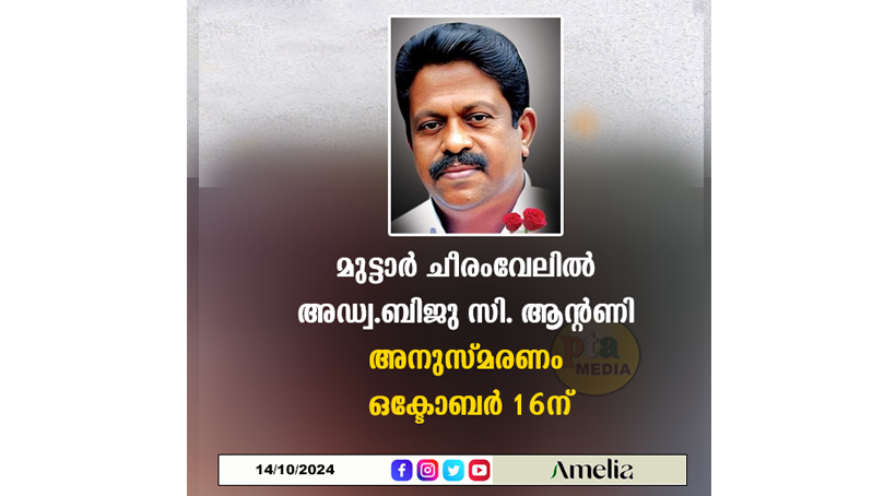 എടത്വ ; സാമൂഹിക – സാംസ്ക്കാരിക രാഷ്ട്രീയ രംഗത്ത് സജീവ സാന്നിദ്ധ്യമായിരുന്ന ചീരംവേലിൽ അഡ്വ.ബിജു സി. ആന്റണിയുടെ ഒന്നാം ചരമ വാർഷികവും അനുസ്മരണ സമ്മേളനവും ഒക്ടോബർ 16ന് 3.30ന് മുട്ടാർ സെന്റ് ജോർജ് ചർച്ച് പാരിഷ് ഹാളിൽ നടക്കും.ഫാദർ ജേക്കബ് ചീരംവേലിൽ അധ്യക്ഷത വഹിക്കും.എടത്വ സെന്റ് ജോർജ്ജ് ഫൊറോന പള്ളി വികാരി ഫാദർ ഫിലിപ്പ് വൈക്കത്തുകാരൻ വീട്ടിൽ ഉദ്ഘാടനം ചെയ്യും. ചടങ്ങിൽ രാഷ്ട്രീയ – സാംസ്ക്കാരിക – സാമൂഹിക രംഗത്തെ പ്രമുഖർ പങ്കെടുക്കും.