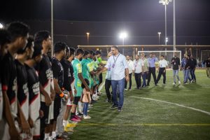 ഫോട്ടോ 2: അബുദാബി മണ്ണാർക്കാട് നിയോജക മണ്ഡലം കെ എം സി സി സെവൻസ് ഫുട്ബോളിൽ സംസ്ഥാന -ജില്ലാ കെഎംസിസി നേതാക്കൾ ടീം അംഗങ്ങളെ പരിചയപ്പെടുന്നു.