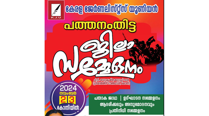 നവംബർ 3 ന് രാവിലെ 10 ന് ആരോഗ്യ-ശിശുക്ഷേമ വകുപ്പ് മന്ത്രി വീണാ ജോർജ് ജില്ലാ സമ്മേളനം ഉദ്ഘാടനം ചെയ്യും. ജില്ലാ പ്രസിഡൻ്റ് രാജു കടക്കരപ്പള്ളി അധ്യക്ഷത വഹിക്കും. യൂണിയൻ പ്രഥമ എക്സലൻസ് അവാർഡ് ഡെപ്യൂട്ടി സ്പീക്കർ ചിറ്റയം ഗോപകുമാർ വിതരണം ചെയ്യും. പത്തനംതിട്ട എം.പി ആൻ്റോ ആൻ്റണി മുഖ്യാതിഥി ആവും. ഉന്നത വിജയം നേടിയ വിദ്യാർത്ഥികളെ കെ.യു ജനീഷ്കുമാർ എം.എൽ.എ ആദരിക്കും. ഐഡി കാർഡ് വിതരണം കെ.ജെ.യു സംസ്ഥാന പ്രസിഡൻ്റ് അനിൽ ബിശ്വാസ് നിർവ്വഹിക്കും. തുടർന്ന് നടക്കുന്ന പ്രതിനിധി സമ്മേളനം ഇന്ത്യൻ ജേർണലിസ്റ്റ്സ് യൂണിയൻ ദേശീയ എക്സിക്യൂട്ടീവ് അംഗം ബാബു തോമസ് ഉദ്ഘാടനം ചെയ്യും. ജില്ലാ സെക്രട്ടറി ബിനോയ് വിജയൻ പ്രവർത്തന റിപ്പോർട്ടും സംസ്ഥാന ജനറൽ സെക്രട്ടറി കെ.സി. സ്മിജൻ സംഘടനാ റിപ്പോർട്ടും അവതരിപ്പിക്കും. തുടർന്ന് ചർച്ച, മറുപടി എന്നിവയ്ക്കു ശേഷം പുതിയ ജില്ലാ കമ്മിറ്റി തെരഞ്ഞെടുപ്പും നടക്കുമെന്ന് കെ.ജെ.യു ജില്ലാ പ്രസിഡൻ്റ് രാജു കടക്കരപ്പള്ളി, ജില്ലാ സെക്രട്ടറി ബിനോയ് വിജയൻ സ്വാഗത സംഘം ചെയർമാൻ ശ്യാംലാൽ കൺവീനർ ഷാഹിർ പ്രണവം എന്നിവർ അറിയിച്ചു.