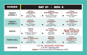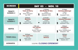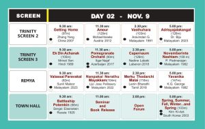 ഒമ്പതിന് രാവിലെ 9.30 മുതൽ നാലു സ്ക്രീനുകളിലായി പ്രദർശനം തുടരും. രാവിലെ 11 ന് ടൗൺഹാളിൽ സെമിനാർ, പുസ്തക പ്രകാശനം ഓപ്പൺ ഫോറം എന്നിവ നടക്കും. അദൃശ്യ ജാലകങ്ങൾ, വലൈസ പറവകൾ എന്നിവയുടെ പ്രദർശനത്തിന് ശേഷം സംവിധായകരായ ഡോ. ബിജു, സുനിൽ മാലൂർ എന്നിവർ പ്രേക്ഷകരുമായി സംവദിക്കും.