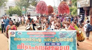 പത്തനംതിട്ട: അന്താരാഷ്ര്ട ചലച്ചിത്ര മേളയുടെ വരവറിയിച്ച് നഗരത്തിൽ നടന്ന വിളംബര ജാഥയിൽ ആയിരങ്ങൾ അണിനിരന്നു. വാദ്യ മേളങ്ങളുടെ അകമ്പടിയിൽ വീട്ടമ്മമാരുടെ തിരുവാതിര മുതൽ പുലികളിയും മലബാർ തെയ്യവും ശിങ്കാര കാവടിയും ആദിവാസി നൃത്തവും പ്ലോട്ടുകളും തെരുവിൽ നിറഞ്ഞതോടെ നഗരത്തിൽ ആവേശത്തിരയിളകി.