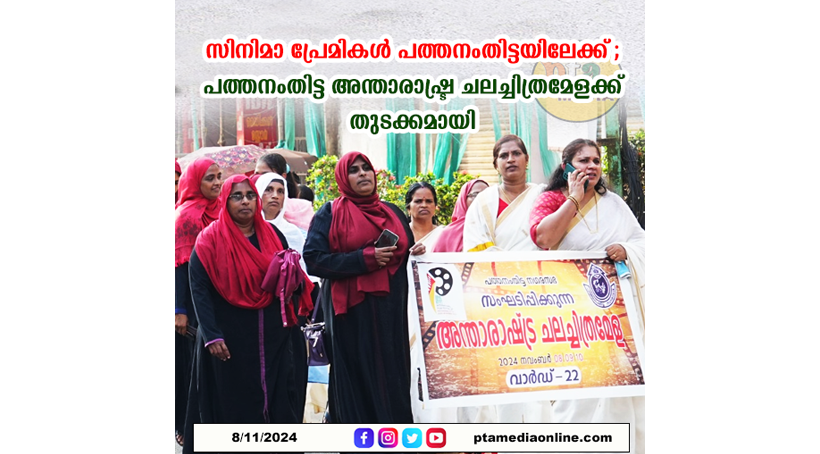 പത്തനംതിട്ട: നഗരസഭ സംഘടിപ്പിക്കുന്ന പ്രഥമ അന്താരാഷ്ര്ട ചലച്ചിത്രോത്സവത്തിന് തുടക്കമായി. ചലച്ചിത്ര അക്കാദമിയുടെ സഹകരണത്തോടെ നടക്കുന്ന മേളയ്ക്ക് പത്തനംതിട്ട ലൂമിയർ ലീഗ് ഫിലിം സൊസൈറ്റിയാണ് ഏകോപനം നിർവഹിക്കുന്നത്. ഉദ്ഘാടന സമ്മേളനം ഇന്ന് വൈകിട്ട് 4.30 ന് ഐശ്വര്യ തീയേറ്ററിൽ നടക്കും. വിഖ്യാത ചലച്ചിത്രകാരൻ ഷാജി.എൻ. കരുൺ ഉദ്ഘാടനം ചെയ്യും. സംഘാടകസമിതി ചെയർമാൻ അഡ്വ. ടി. സക്കീർ ഹുസൈൻ അദ്ധ്യക്ഷത വഹിക്കും. മന്ത്രി വീണാ ജോർജ് ഫെസ്റ്റിവൽ ബുക്ക് പ്രകാശനം ചെയ്യും. സംവിധായകൻ കവിയൂർ ശിവപ്രസാദ് മുഖ്യാതിഥിയായിരിക്കും. ഫെസ്റ്റിവൽ ലോഗോ രൂപകൽപ്പനയ്ക്കുള്ള സമ്മാനം ആന്റോ ആന്റണി എം.പി വിതരണം ചെയ്യും. തുടർന്ന് മൂന്ന് ദേശീയ അവാർഡുകൾ നേടിയ ആനന്ദ് ഏകർഷിയുടെ ആട്ടം പ്രദർശിപ്പിക്കും.മലയാളം, ഇന്ത്യൻ, ലോകം എന്നീ മൂന്ന് വിഭാഗങ്ങളിലായി 28 സിനിമകൾ പ്രദർശിപ്പിക്കും. ട്രിനിറ്റി മൂവി മാക്സ് സ്ക്രീൻ 2,3, രമ്യ എന്നീ തീയറ്ററുകളും ടൗൺഹാളുമാണ് പ്രദർശന വേദികൾ.