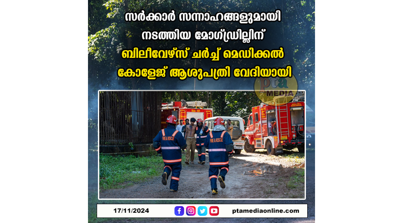 തിരുവല്ല : പത്തനംതിട്ട ജില്ലാ കളക്ടർ ശ്രീ പ്രേംകൃഷ്ണൻ എസ് ഐഎഎസ് ന്റെ നിർദ്ദേശപ്രകാരം തിരുവല്ല സബ് കളക്ടർ ശ്രീ സുമിത് കുമാർ താക്കൂറിന്റെയും തഹസിൽദാർ ശ്രീമതി സിനി മാത്യുവിൻ്റെയും സാന്നിധ്യത്തിൽ എൻ ഡി ആർ എഫ്, ഫയർ ആൻഡ് റെസ്ക്യൂ, കേരള പോലീസ് എന്നിവരുടെ സംയുക്ത സഹകരണത്തിൽ നടന്ന മോക്ക് ഡ്രില്ലിന് ബിലീവേഴ്സ് ചർച്ച് മെഡിക്കൽ കോളേജ് ആശുപത്രി വേദിയായി. ഇന്ത്യയിലാദ്യമായാണ് സർക്കാർ സമ്പൂർണ്ണ സന്നാഹങ്ങളുമായി സ്വകാര്യ സ്ഥാപനത്തിൻറെ സഹകരണത്തോടെ ഇങ്ങനെയൊരു മോക്ക് ഡ്രിൽ നടത്തുന്നത്. ജോൺസ് ഹോപ്പ്ക്കിൻസ് സർവ്വകലാശാല, വെയ്ൻ സർവ്വകലാശാല, ജോർജ് വാഷിംഗ്ടൺ സർവ്വകലാശാല തുടങ്ങിയ വിദേശ സർവകലാശാലകളുടെയും വെല്ലൂർ സിഎംസി , ബാംഗ്ലൂർ നിംഹാൻസ് തുടങ്ങിയ ആരോഗ്യ സ്ഥാപനങ്ങളുടെയും സംയുക്ത ആഭിമുഖ്യത്തിൽ ബിലീവേഴ്സ് ചർച്ച് മെഡിക്കൽ കോളേജ് ആശുപത്രിയിൽ നടന്നുവന്നിരുന്ന രാജ്യാന്തര കോൺഫറൻസിന്റെ സമാപനദിവസമാണ് പ്രസ്തുത മോക്ക് ഡ്രിൽ സംഘടിപ്പിച്ചത്. ദുരന്ത നിവാരണ പ്രതിരോധ മാർഗങ്ങളെക്കുറിച്ച് നടത്തിയ രാജ്യാന്തര കോൺഫറൻസിന് യുണൈറ്റഡ് 24 എന്നായിരുന്നു പേര് നൽകിയിരുന്നത്. ഒരു കെട്ടിടം തകർന്നുവീണതായും പുക ഉയരുന്നതായും വിഷവാതകമാണോ എന്ന സംശയത്തെ തുടർന്ന് കൂടുതൽ സംവിധാനങ്ങൾ എത്തി സുരക്ഷ മാനദണ്ഡങ്ങൾ പാലിച്ച് അപകടത്തിൽപ്പെട്ടവരെ ആശുപത്രിയിൽ എത്തിക്കുന്നതായുമായ സാഹചര്യമാണ് മോക്ക് ഡ്രില്ലിലൂടെ പ്രദർശിപ്പിച്ചത്. അപകട വിവരം അറിയിക്കപ്പെട്ടതിനെ തുടർന്ന് അതിവേഗം എത്തിയ ഫയർ ആൻ്റ് റെസ്ക്യൂ സംഘം കെട്ടിടത്തിനുള്ളിൽ വിഷവാതകം ആണോ എന്ന് സംശയിച്ച് വിദഗ്ദ്ധ സംഘമായ HAZMAT ( Hazardous material ) സംഘം എത്തി സുരക്ഷ വിലയിരുത്തിയാണ് പരിക്കേറ്റവരെ ബിലീവേഴ്സ് ചർച്ച് മെഡിക്കൽ കോളേജ് ആശുപത്രിയുടെ എമർജൻസി വിഭാഗത്തിലേക്ക് മാറ്റി. അതേ സമയം നിർദ്ദിഷ്ട കോഡ് പ്രഖ്യാപനം നടത്തി ബിലീവേഴ്സ് ആശുപത്രിയുടെ മെഡിക്കൽ സംഘം സജ്ജരായി. ആശുപത്രിയുടെ ദുരന്ത പ്രതിരോധ സാഹചര്യങ്ങളുടെ വിലയിരുത്തലുകളും മോക് ഡ്രില്ലിനിടയിൽ നടന്നു.