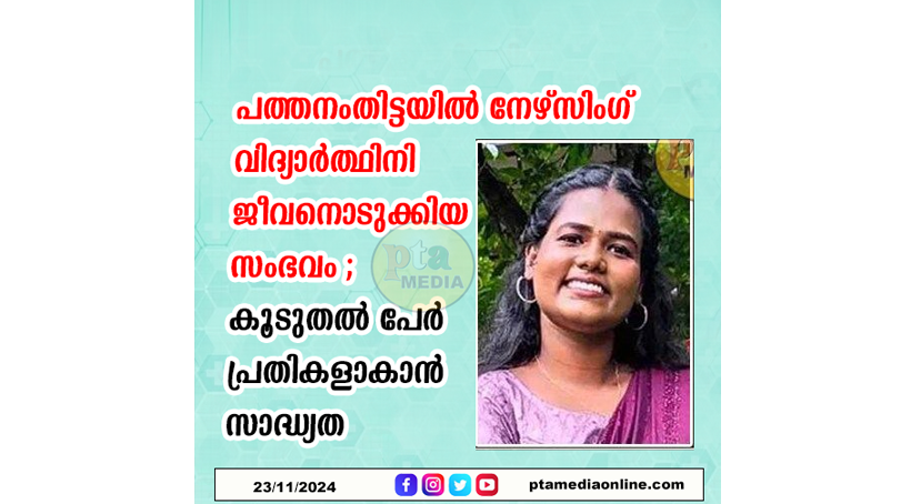 പത്തനംതിട്ട: ചുട്ടിപ്പാറ സിപ്സ് നഴ്സിങ് ആൻഡ് പാരാമെഡിക്കൽ സയൻസ് കോളജിലെ വിദ്യാർഥിനി തിരുവനന്തപുരം അയിരൂപ്പാറ സ്വദേശി അമ്മുവിന്റെ മരണത്തിൽ ആത്മഹത്യാ പ്രേരണാകുറ്റം ചുമത്തി റിമാൻഡിൽ കഴിയുന്ന സഹപാഠികളെ കസ്റ്റഡിയിൽ കിട്ടാൻ പോലീസ് ഒന്നാം ക്ലാസ് ജുഡീഷ്യൽ മജിസ്ട്രേറ്റ് കോടതിയിൽ അപേക്ഷ നൽകി. തിങ്കളാഴ്ച അപേക്ഷ പരിഗണിക്കും.