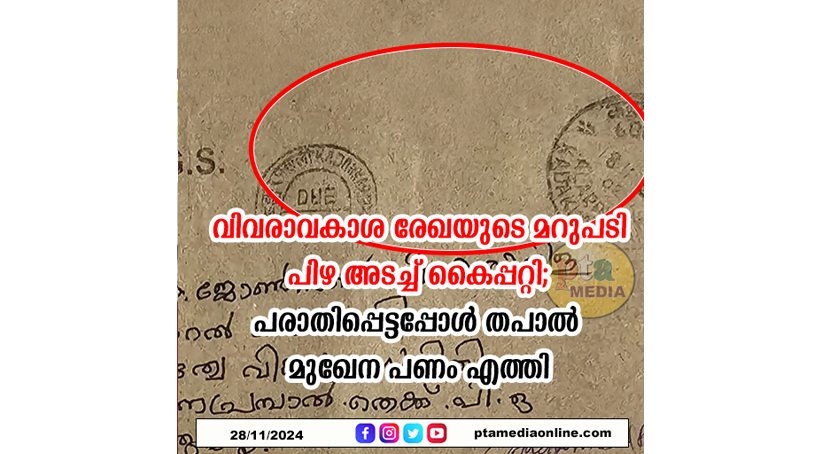 വിവരാവകാശ രേഖയുടെ മറുപടി പിഴ അടച്ച് കൈപ്പറ്റി; പരാതിപ്പെട്ടപ്പോൾ തപാൽ മുഖേന പണം എത്തി
