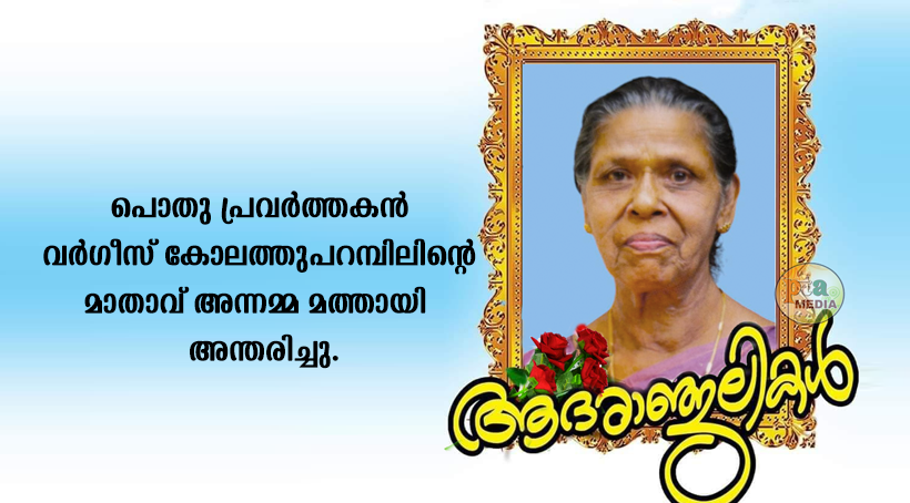 തലവടി: കോൺഗ്രസ് തലവടി മണ്ഡലം പ്രസിഡന്റ് വർഗീസ് കോലത്തുപറമ്പിലിന്റെ മാതാവും ആനപ്രമ്പാൽ കോലത്തുപറമ്പിൽ വർഗീസ് മത്തായിയുടെ (കുഞ്ഞുമോൻ) ഭാര്യയുമായ അന്നമ്മ മത്തായി (72) അന്തരിച്ചു. സംസ്കാരം ഡിസംബർ 02 ?ന് രാവിലെ 11.30ന് ഭവനത്തിലെ ശുശ്രൂഷകൾക്ക് ശേഷം ആനപ്രമ്പാൽ സെന്റ് ജോർജ്ജ് ഓർത്തഡോക്സ്പള്ളിയിൽ.പരേത പാവുക്കര മൂർത്തിട്ട കുടുംബാംഗമാണ്. ഷൈനി,ഷിനു എന്നിവരും മക്കളാണ്. മരുമക്കൾ: ലിബി വർഗീസ് (നിരണം), സജി ചാക്കോ മംഗലശേരിൽ (തിരുവല്ല), സോണിയ ഷിനു (ഇടുക്കി).