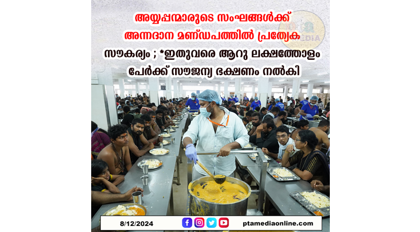 ശബരിമല: സന്നിധാനത്തെ ആധുനിക അന്നദാന മണ്ഡപത്തിൽ സംഘമായെത്തുന്ന അയ്യപ്പന്മാർക്ക് ഒരുമിച്ചിരുന്ന് ഭക്ഷണം കഴിക്കാൻ ദേവസ്വം ബോർഡ് സൗകര്യം ഏർപ്പെടുത്തി. പ്രവേശന കവാടത്തിൽ നിന്നും കൂപ്പൺ എടുത്ത ശേഷം അന്നദാന മണ്ഡപത്തിൽ കൂട്ടമായിരുന്ന് ഭക്ഷണം കഴിക്കുന്നതിനാണ് വലിയ മണ്ഡപത്തിൽ സൗകര്യം ഒരുക്കിയിരിക്കുന്നത്. പ്രായമായവർക്കും ആരോഗ്യകരമായി അവശത നേരിടുന്നവർക്കും കുട്ടികൾക്കും പ്രത്യേക പരിഗണന നൽകുമെന്നും അന്നദാനം സ്പെഷ്യൽ ഓഫീസർ ദിലീപ് കുമാർ അറിയിച്ചു.