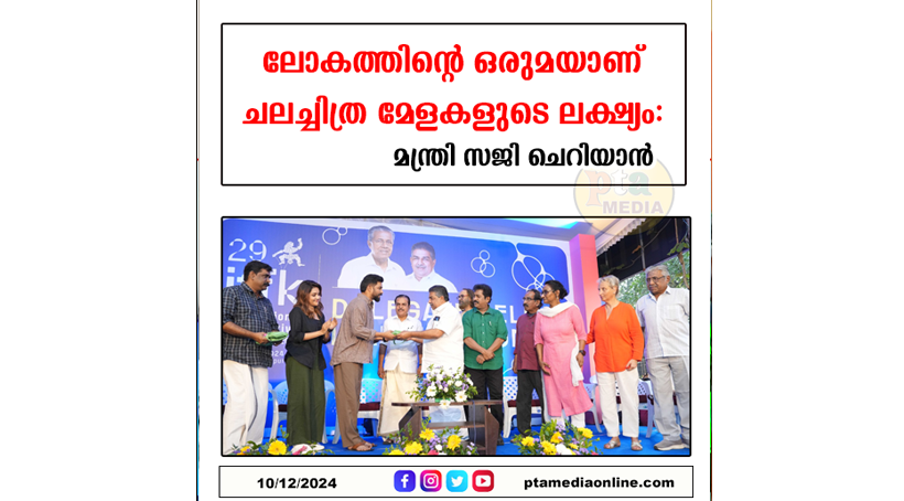 തിരുവനന്തപുരം – ലോകത്തിന്റെ ഒരുമയാണ് ചലച്ചിത്ര മേളകളുടെ ലക്ഷ്യമെന്നും ഇതിന്റെ ഏറ്റവും മികച്ച ഉദാഹരണമാണ് കേരള രാജ്യാന്തര ചലച്ചിത്ര മേളയെന്നും സാംസ്കാരിക വകുപ്പ് മന്ത്രി സജി ചെറിയാൻ. 29-)മത് കേരള രാജ്യാന്തര ചലച്ചിത്ര മേളയുടെ ഡെലിഗേറ്റ് സെല്ലിന്റെ ഉദ്ഘാടനവും ഡെലിഗേറ്റ് കിറ്റുകളുടെ വിതരണോദ്ഘാടനവും നിർവഹിക്കുകയായിരുന്നു മന്ത്രി. സിനിമാ താരങ്ങളായ ഷറഫുദ്ദീനും മഹിമ നമ്പ്യാരും മന്ത്രിയിൽ നിന്ന് ഡെലിഗേറ്റ് കിറ്റുകൾ ഏറ്റുവാങ്ങി.