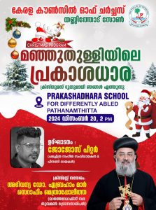 തണ്ണിത്തോട്.”മഞ്ഞുതുള്ളിയിലെ പ്രകാശധാര” വേറിട്ട ക്രിസ്തുമസ്സ് കൂട്ടായ്മയുമായി കേരള കൗൺസിൽ ഓഫ് ചർച്ചസ് തണ്ണിത്തോട് സോൺ പത്തനംതിട്ട ജില്ലയിലെ ( School For Differently Abled) സ്ക്കൂൾ ആയ പ്രകാശധാരയിൽ വെച്ച് കുട്ടികൾക്ക് ഒപ്പം ക്രിസ്മസ്സ് കൂട്ടായ്മ സംഘടിപ്പിക്കുന്നു.