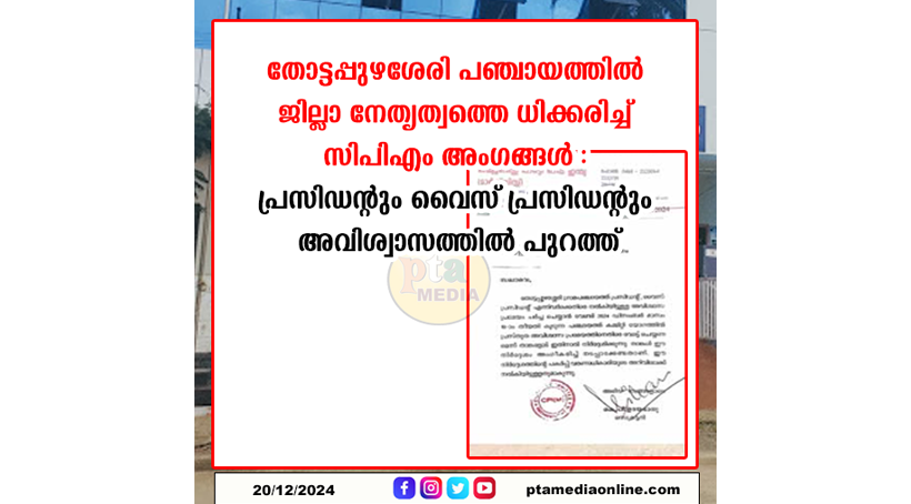പത്തനംതിട്ട: തോട്ടപ്പുഴശേരി പഞ്ചായത്തിൽ പ്രസിഡന്റും വൈസ് പ്രസിഡന്റും അവിശ്വാസത്തിലൂടെ പുറത്ത്. ജില്ലാ സെക്രട്ടറിയുടെ വിപ്പ് ലംഘിച്ച സിപിഎം അംഗങ്ങൾ യുഡിഎഫുമായി ചേർന്നാണ് അവിശ്വാസം പാസാക്കിയെടുത്തത്. പാർ്ട്ടിയിലെ ചില കീടങ്ങളാണ് തങ്ങളെ ഈ അവസ്ഥയിൽ എത്തിച്ചതെന്ന് സിപിഎം അംഗം തുറന്നടിച്ചു.