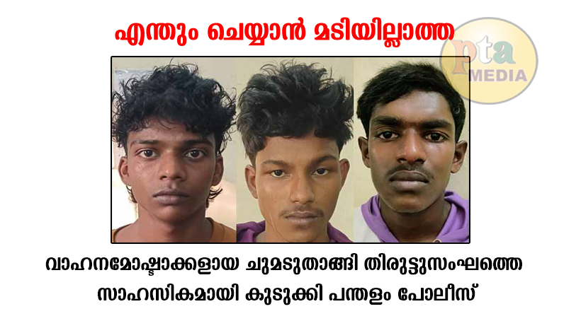 പന്തളം: രണ്ട് കൗമാരക്കാരുള്പ്പെടെ ആറു പേരടങ്ങുന്ന ‘ചുമടുതാങ്ങി തിരുട്ടുസംഘ’ത്തിലെ മൂന്നുപേരെ, കൂട്ടത്തിലെ 16 കാരനിലൂടെ വലവിരിച്ച് പന്തളം പോലീസ് ശ്രമകരമായി കീഴടക്കി. ഒന്നരവര്ഷമായി വാഹനങ്ങളടക്കം മോഷണങ്ങള് ഹരമാക്കിയ, നാട്ടില് ഭീതി വിതച്ച് ജനങ്ങളുടെ ഉറക്കം കെടുത്തിയ, യുവാക്കളും കൗമാരക്കാരുമടങ്ങിയ തസ്കരസംഘത്തിലെ പ്രധാന കണ്ണികളാണ് പോലീസിന്റെ, നാളുകള് നീണ്ട ശ്രമകരവും സാഹസികവുമായ നീക്കത്തില് കുടുങ്ങിയത്. കടമ്പനാട് കല്ലുകുഴി മുക്കുന്നിവടക്കേതില് കുട്ടു എന്ന് വിളിക്കുന്ന ബിജീഷ് (19), കൊല്ലം കുന്നത്തൂര് പടിഞ്ഞാറ്റേ മുറിയില് നെടിയവിള മാണിക്കമംഗലം കോളനിയില് പാലിക്കലേത്ത് വീട്ടില് ആദിത്യന് (19), കൊല്ലം പോരുവഴി ഇടയ്ക്കാട് ചാലമുക്ക് ബിവറേജസ് ഷോപ്പിന് സമീപം കുളത്തരയ്യത്ത് വീട്ടില് നിഖില് (20) എന്നിവരാണ് പിടിയിലായത്. വാഹനമോഷണം പതിവാക്കി ജനങ്ങളില് പരിഭ്രാന്തി പരത്തി വിഹരിച്ച സംഘത്തിന് കല്ലുകുഴി നിവാസികള് ചുമടുതാങ്ങി ജംഗ്ഷന്റെ പേര് നല്കുകയായിരുന്നു. അങ്ങനെയാണ് നാടിന്റെ പേരില് തിരുട്ടുസംഘമെന്ന നിലയില് ഇവര് കുപ്രസിദ്ധരായത്.