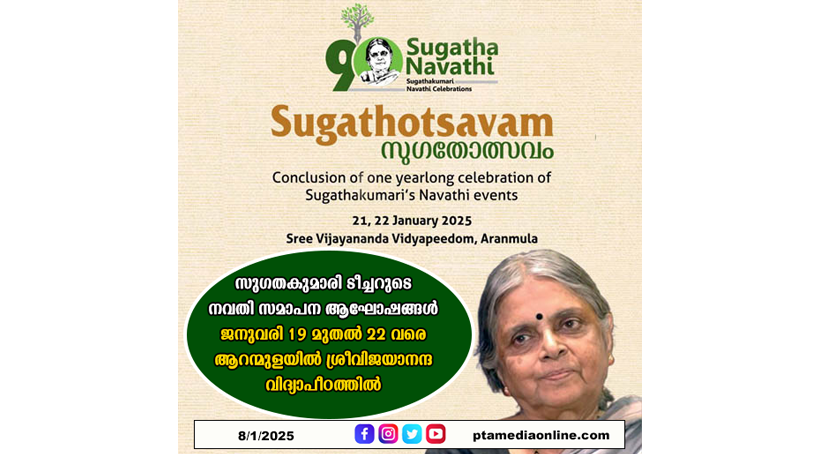 തിരുവനന്തപുരം: പ്രകൃതിക്കും മനുഷ്യാവകാശങ്ങൾക്കും വേണ്ടി ജീവിതത്തിലുടനീളം നിരന്തര പോരാട്ടങ്ങൾ നടത്തിയ സുഗതകുമാരി ടീച്ചറുടെ നവതി സമാപന ആഘോഷങ്ങൾ ജനുവരി 19 മുതൽ 22 വരെ ആറന്മുളയിൽ ശ്രീവിജയാനന്ദവിദ്യാപീഠത്തിൽ നടക്കും. സുഗതോത്സവം എന്ന പേരിൽ നടക്കുന്ന പരിപാടികളുടെ സമാപന സഭ സുഗതകുമാരി ടീച്ചറുടെ 91-മത് ജന്മവാർഷികദിനമായ ജനുവരി 22 ഉച്ചക്ക് ശേഷം 3 മണിക്ക് കേന്ദ്ര പ്രതിരോധ വകുപ്പുമന്ത്രി രാജ്നാഥ് സിംഗ് ഉദ്ഘാടനം ചെയ്യും.