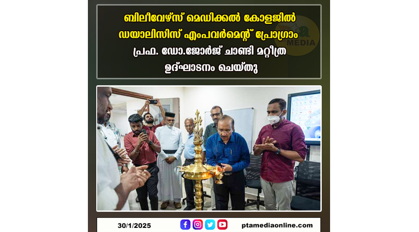 തിരുവല്ല: ബിലീവേഴ്സ് ചർച്ച് മെഡിക്കൽ കോളേജ് ആശുപത്രി ഫിസിക്കൽ മെഡിസിൻ ആൻഡ് റിഹാബിലിറ്റേഷൻ വിഭാഗത്തിന്റെയും നെഫ്രോളജി വിഭാഗത്തിന്റെയും സംയുക്താഭിമുഖ്യത്തിൽ ഡയാലിസിസ് എംപവർമെന്റ് പ്രോഗ്രാം ആരംഭിച്ചു. ബിലീവേഴ്സ് ആശുപത്രി ഡയറക്ടറും സി.ഇ.ഓയുമായ പ്രഫ. ഡോ.ജോർജ് ചാണ്ടി മറ്റീത്ര ഉദ്ഘാടനം ചെയ്തു. അസോസിയേറ്റ് ഡയറക്ടർ ഡോ ജോൺ വല്യത്ത് അധ്യക്ഷത വഹിച്ചു. രോഗികൾക്ക് ഡയാലിസിസ്സിന് ഒപ്പവും അതിനു മുന്നോടിയായും വേണ്ട ഫിസിയോതെറാപ്പി സേവനങ്ങൾ ഇനി മുതൽ ബിലീവേഴ്സിൽ ലഭ്യമായിരിക്കും.