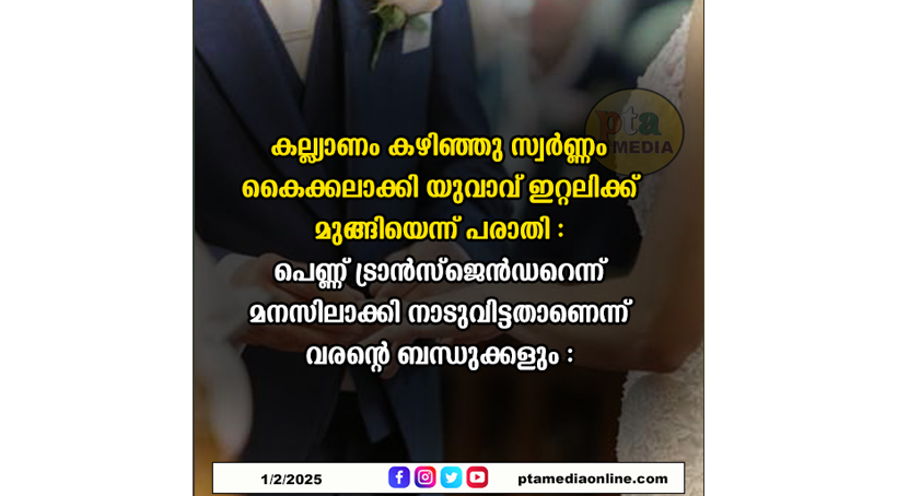 വിവാഹദിവസം രാത്രി മണിയറയിലേക്ക് ചെന്ന വരൻ ഞെട്ടിയത്രേ. പാന്റ്സ് മാത്രം ധരിച്ച് ഒരു യുവാവ് കട്ടിലിൽ കിടക്കുന്നു. അന്ന് പകൽ താൻ വിവാഹം ചെയ്ത യുവതിയാണതെന്ന തിരിച്ചറിവിൽ യുവാവ് ഞെട്ടി. വിവാഹത്തിന് വധുവിന്റെ കഴുത്തിൽ അണിയിച്ച അഞ്ചു പവന്റെ താലിമാല വല്ല വിധേനെയും ഊരി വാങ്ങി പിറ്റേന്ന് തന്നെ വധുവിന്റെ വീട്ടിൽ കൊണ്ടാക്കി. വധുവിന് മാതാവ് മാത്രമേയുള്ളു. ട്രാൻസ്ജെൻഡർ ആണെന്ന വിവരം മറച്ചു വച്ച് വധുവിന്റെ വീട്ടുകാർ യുവാവിനെ പറ്റിച്ചുവെന്നാണ് പരാതി.