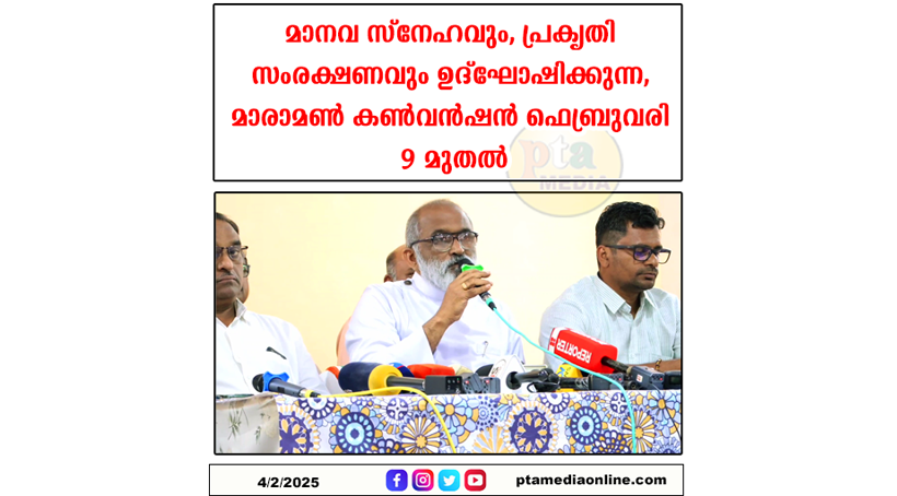 കോഴഞ്ചേരി – മാരാമൺ കൺവൻഷൻ ഫെബ്രുവരി ഒമ്പത് മുതൽ 16 വരെ പമ്പാനദിക്കരയിലെ മാരാമൺ മണൽപ്പുറത്ത് നടക്കും. ഫെബ്രുവരി ഒമ്പതിന് പകൽ 2.30 ന് മാർത്തോമ സഭാദ്ധ്യക്ഷൻ ഡോ. തിയഡോഷ്യസ് മാർത്തോമ മെത്രാപ്പോലീത്ത കൺവൻഷൻ ഉദ്ഘാടനം ചെയ്യും. പതിനായിരക്കണക്കിന് വിശ്വാസികൾക്ക് ഇരിക്കാൻ പാകത്തിലുള്ള ഓലമേഞ്ഞ പന്തൽ, അമ്മമാർക്കും കുട്ടികൾക്കുമായി കുട്ടിപ്പന്തൽ അടക്കം വിപുലമായ സൗകര്യങ്ങൾ. നദിക്ക് കുറുകെ മൂന്ന് താൽക്കാലിക പാലങ്ങൾ പൂർത്തിയായി. മനുഷ്യ സ്നേഹത്തിന്റെയും, കരുതലിന്റെയും, പ്രകൃതി സംരക്ഷണത്തിന്റെയും വചനങ്ങൾ ഉദ്ഘോഷിക്കുന്ന കൺവൻഷനിൽ പതിനായിരങ്ങൾ ഒഴുകിയെത്തും.