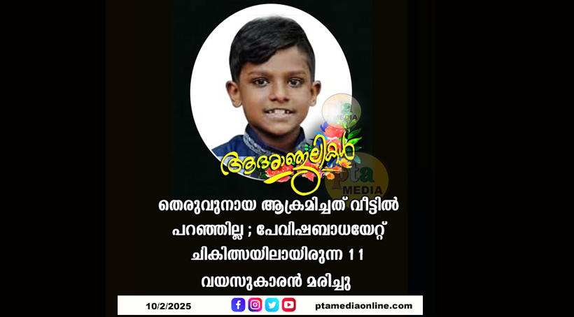 തെരുവുനായ ആക്രമിച്ചത് വീട്ടിൽ പറഞ്ഞില്ല ; പേവിഷബാധയേറ്റ് ചികിത്സയിലായിരുന്ന 11 വയസുകാരൻ മരിച്ചു