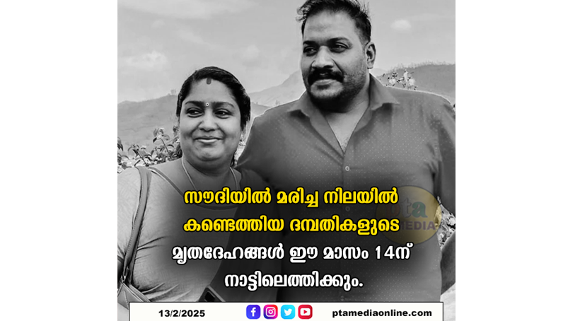 ദമാം – സൗദി അറേബ്യയിലെ അൽ ഖസീം പ്രവിശ്യയിലെ ഉനൈസയിൽ കഴിഞ്ഞ നവംബർ 14ന് മരിച്ച നിലയിൽ കണ്ടെത്തിയ മലയാളി ദമ്പതികളുടെ മൃതദേഹം ഈ മാസം 14ന് നാട്ടിലെത്തിക്കും. കൊല്ലം ചിതറ സ്വദേശി ഭജനമഠം പത്മവിലാസത്തിൽ മണിയനാചാരിയുടെ മകൻ ശരത് (42), സന്ദർശക വീസയിൽ ഒപ്പമുണ്ടായിരുന്ന ഭാര്യ കൊല്ലം മാന്തോപ്പിൽ അക്ഷരനഗർ പ്രവീൺ നിവാസിൽ പ്രീതി (32) എന്നിവരാണ് മരിച്ചത്.