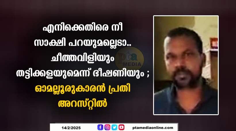 പത്തനംതിട്ട: സാക്ഷിമൊഴി മാറ്റിപ്പറയാത്ത വിരോധം കാരണം ഭീഷണിപ്പെടുത്തുകയും അസഭ്യം വിളിക്കുകയും ചെയ്ത പ്രതിയെ പത്തനംതിട്ട പോലീസ് അറസ്റ്റ് ചെയ്തു. ഓമല്ലൂർ പറയനാലി മലങ്കാവ് കൊച്ചുമുരുപ്പേൽ വീട്ടിൽ എം ടി സാകുട്ടി (39) ആണ് പിടിയിലായത്. ഇയാൾ നേരത്തെ ഉൾപ്പെട്ട കേസിൽ സാക്ഷിയായ ഓമല്ലൂർ പറയനാലി മടുക്കുവലിൽ വീട്ടിൽ ജിജോ മോൻ ജോജിയെയാണ്, സാക്ഷിമൊഴി മാറ്റിപ്പറയാത്തതിന് കഴിഞ്ഞ എട്ടിനു രാവിലെ മലങ്കാവ് ജങ്ഷനിൽ തടഞ്ഞുനിർത്തി ഭീഷണിപ്പെടുത്തിയത്. ഒരാളെ കൊന്ന തനിക്ക് മൂന്നുപേരെ കൊന്നാലും ശിക്ഷ ഒന്നുതന്നെയാണ് എന്ന് പറഞ്ഞുകൊണ്ട് അസഭ്യം പറയുകയും ചെയ്തു.