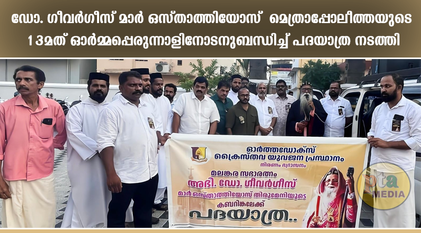 തിരുവല്ല : അശരണരുടേയും ആലംബഹീനരുടെയും പിതാവും നിരണം ഭദ്രാസനാധിപനായിരുന്ന ഭാഗ്യ സ്മരണർഹനായ മലങ്കരസഭ രത്നം ഡോ. ഗീവർഗീസ് മാർ ഒസ്താത്തിയോസ് മെത്രാപ്പോലീത്തയുടെ 13-മത് ഓർമ്മപ്പെരുന്നാളിനോടനുബന്ധിച്ച് ഓർത്തഡോക്സ് ക്രൈസ്തവ യുവജന പ്രസ്ഥാനം നിരണം ഭദ്രാസന സമിതിയുടെ നേതൃത്വത്തിൽ മാവേലിക്കര പുതിയകാവ് കത്തീഡ്രലിൽ നിന്ന് സെൻ്റ് പോൾസ് മിഷൻ ട്രെയിനിംഗ് സെന്ററിലേക്ക് പദയാത്ര നടത്തി. ഭദ്രാസനാധിപൻ ഡോ. യൂഹാനോൻ മാർ ക്രിസോസ്റ്റമോസ് മെത്രാപ്പോലീത്താ ഉദ്ഘാടനം ചെയ്തു. അസോസിയേഷൻ സെക്രട്ടറി ബിജു ഉമ്മൻ, യുവജന പ്രസ്ഥാനം കേന്ദ്ര വൈസ് പ്രസിഡൻ്റ് ഫാ. ഷിജി കോശി, ഭദ്രാസന വൈസ് പ്രസിഡൻ്റ് ഫാ. ബിബിൻ മാത്യു, ഭദ്രാസന സെക്രട്ടറി റിനോജ് ജോർജ് ഗീവർഗീസ്, മുൻ കേന്ദ്ര ജനറൽ സെക്രട്ടറി ഫാ. അജി കെ. തോമസ്, മുൻ ട്രഷറാർ ജോജി പി. തോമസ്, സജി മാമ്പക്കുഴിയിൽ, മത്തായി ടി. വർഗീസ്, യുവജന പ്രസ്ഥാനം ഭാരവാഹികളായ ജോജി ജോർജ്, ഡോണിയ നൈനാൻ, രോഹിത് കെ. ജോൺ, ജോയൻ വർഗിസ്, ചെറിയാൻ മണലേൽ, അഭിലാഷ് തോമസ്, അശ്വിൻ വി. റെജി, ദിബാ വി. ജേക്കബ് എന്നിവർ നേതൃത്വം നൽകി.
