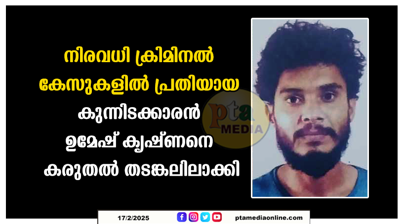 പത്തനംതിട്ട: നിരവധി ക്രിമിനൽ കേസുകളിൽ പ്രതിയായ യുവാവിനെ സാമൂഹിക വിരുദ്ധ പ്രവർത്തനങ്ങൾ തടയൽ നിയമത്തിലെ വകുപ്പ് 3 പ്രകാരം ഏനാത്ത് പോലീസ് കരുതൽ തടങ്കലിലാക്കി. ജില്ലാ മജിസ്ട്രേറ്റ് കൂടിയായ ജില്ലാ കലക്ടറുടെ ഉത്തരവിന്റെ അടിസ്ഥാനത്തിലാണ് നടപടി. അടൂർ ഏനാദിമംഗലം കുന്നിട ഉഷാഭവനം ഉമേഷ് കൃഷ്ണനെ(32)യാണ് അറസ്റ്റ് ചെയ്ത് കരുതൽ തടങ്കലിലാക്കിയത്. തുടർച്ചയായി സാമൂഹികവിരുദ്ധ പ്രവർത്തനങ്ങളിൽ ഏർപ്പെട്ടുവരുന്ന പ്രതി ‘ അറിയപ്പെടുന്ന റൗഡി ‘ ലിസ്റ്റിൽ ഉൾപ്പെടുന്നയാളാണ്. ഏനാത്ത് ആറന്മുള പന്തളം കൊട്ടാരക്കര പത്തനാപുരം അച്ചൻകോവിൽ തുടങ്ങിയ പോലീസ് സ്റ്റേഷൻ പരിധികളിൽ അടിക്കടി ക്രമസമാധാന പ്രശ്നങ്ങളുണ്ടാക്കിയതിനു ഇയാൾക്കെതിരെ നിരവധി ക്രിമിനൽ കേസുകൾ നിൽവിലുണ്ട്.