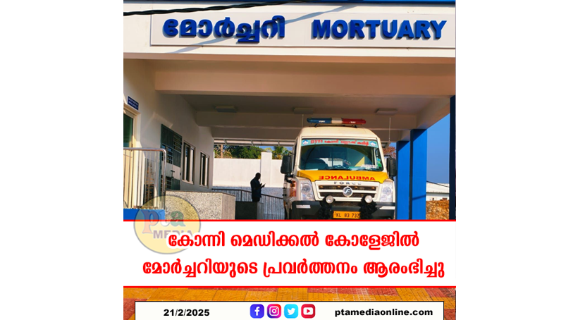കോന്നി – ഗവ. മെഡിക്കൽ കോളജിൽ നിർമ്മാണം പൂർത്തീകരിച്ച മോർച്ചറി ബ്ലോക്ക് പ്രവർത്തനമാരംഭിച്ചു.. ഫെബ്രുവരി മാസം ഒന്നാം തീയതി കെ.യു.ജനീഷ് കുമാർ എംഎൽഎ അധ്യക്ഷത വഹിച്ച ചടങ്ങിൽ ആരോഗ്യ മന്ത്രി വീണാ ജോർജ് ആണ് ഉദ്ഘാടനം നിർവ്വഹിച്ചത്. മോർച്ചറി ബ്ലോക്കിൽ മജിസ്റ്റീരിയൽ, പൊലീസ് ഇൻക്വസ്റ്റ് റൂമുകൾ, 10 കോൾഡ് ചേംബർ, നാല് ഓട്ടോപ്സി ടേബിൾ, മെഡിക്കൽ ഓഫിസർ റൂം, സ്റ്റാഫ് റൂമുകൾ, റിസപ്ഷൻ എന്നിങ്ങനെയാണ് ഉള്ളത്. മൃതദേഹം സൂക്ഷിക്കാനുള്ള 10 കോൾഡ് ചേംബറുകളിൽ ആറ് ചേംബറുകളും പോസ്റ്റ്മോർട്ടം ടേബിളുകളിൽ ഒരെണ്ണവുമാണു നിലവിൽ സ്ഥാപിച്ചിട്ടുള്ളത്.