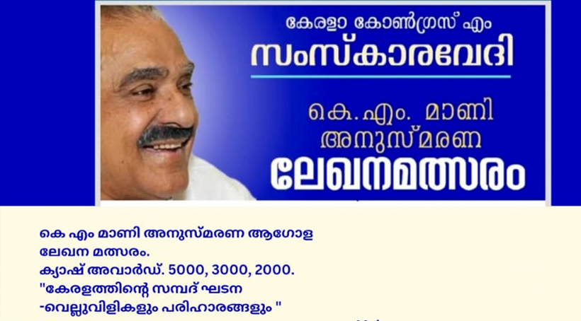 കോട്ടയം – കേരള കോൺഗ്രസ് എം സംസ്കാരവേദിയുടെ ആഭിമുഖ്യത്തിൽ കേരള കോൺഗ്രസ് എം സ്ഥാപകനും ദീർഘകാലം കേരളത്തിന്റെ ധനകാര്യ മന്ത്രിയുമായിരുന്ന കെ എം മാണിയുടെ ആറാം ചരമവാർഷികത്തടനുബന്ധിച്ച് ആഗോള മലയാള ലേഖന മത്സരം നടത്തുന്നു