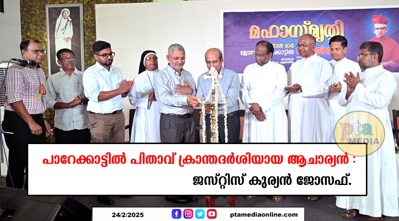 അങ്കമാലി : പാറേക്കാട്ടിൽ പിതാവ് വഴിയും വഴിയറിഞ്ഞവനും അറിഞ്ഞ വഴിയേ പോയവനും ലിറ്റർജിയിൽ സാംസ്കാരികാനുരൂപണം കൊണ്ടുവന്ന ആചാര്യനും ക്രാന്തദർശിയുമായിരുന്നെന്ന് ജസ്റ്റിസ് കുര്യൻ ജോസഫ്. മൂന്നു പതിറ്റാണ്ടോളം ആചാര്യ ശുശ്രൂഷാ രംഗത്ത് പ്രശോഭിച്ച് കത്തോലിക്കാ സഭയെ യശ്ശസ്സിൻ്റെ കൊടുമുടിയിലേക്ക് ഉയർത്തിയ കേരളത്തിൽ നിന്നുള്ള പ്രഥമ കർദ്ദിനാൾ മാർ ജോസഫ് പാറേക്കാട്ടിൽ പിതാവിൻ്റെ 38ാം ചരമ വാർഷികം കിടങ്ങൂർ ഉണ്ണിമിശിഹാ പാരീഷ് ഹാളിൽ ഉദ്ഘാടനംചെയ്തുസംസാരിക്കുകയായിരുന്നു അദ്ദേഹം.