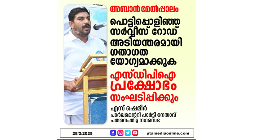 പത്തനംതിട്ട – നഗരത്തെ, ജനങ്ങളെ, വ്യാപാരികളെ ഒക്കെ ബുദ്ധിമുട്ടിക്കുന്ന അബാന് മേല്പാലം നിർമ്മാണം എങ്ങുമെത്താതെ പ്രതിസന്ധിയിലായി കിടക്കുമ്പോൾ, അനുബന്ധമായി താറുമാറായി കിടക്കുന്ന സര്വ്വീസ് റോഡ് അടിയന്തരമായി ഗതാഗത യോഗ്യമാക്കണമെന്നാവശ്യപ്പെട്ട് പ്രക്ഷോഭം സംഘടിപ്പിക്കുമെന്ന് പത്തനംതിട്ട നഗരസഭ എസ്ഡിപിഐ പാര്ലമെന്ററി പാര്ട്ടി നേതാവ് എസ് ഷെമീര് പറഞ്ഞു.