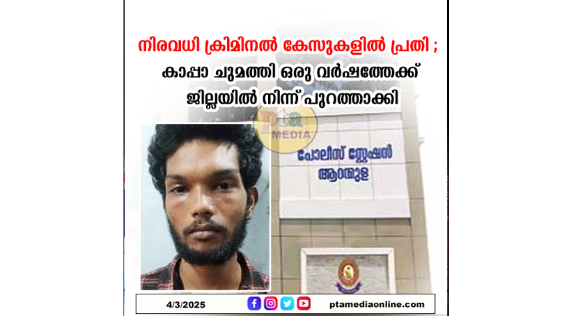 നിരവധി ക്രിമിനൽ കേസുകളിൽ പ്രതി ; കാപ്പാ ചുമത്തി ഒരു വർഷത്തേക്ക് ജില്ലയിൽ നിന്ന് പുറത്താക്കി