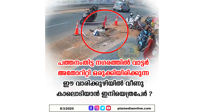 പത്തനംതിട്ട: നഗര ഹൃദയത്തിൽ മിനി സിവിൽ സ്റ്റേഷന് എതിർവശത്തെ റോഡിൽ പൈപ്പ് പൊട്ടിയുണ്ടായ കുഴി പരിഹരിക്കാൻ ദിവസങ്ങൾ കഴിഞ്ഞിട്ടും യാതൊരു നടപടിയുമില്ല. ഒരു കാഴ്ചാ പരിമിതൻ കുഴിയിൽ വീണെങ്കിലും കാലൊടിയാതെ രക്ഷപ്പെട്ടു. വ്യാഴാഴ്ച അതിരാവിലെയാണു പൈപ്പ് പൊട്ടിയത്. അതിശക്തമായ പൊട്ടലിൽ റോഡിന്റെ വശത്ത് ഗർത്തം രൂപം കൊണ്ടു കടകളിലേക്ക് വെള്ളം ഇരച്ചു കയറി നാശനഷ്ടം നേരിട്ടു. തുണിക്കടകളിൽ തുണി നനഞ്ഞു. മൊബൈൽ കടകൾ ഉൾപ്പെടെ വെള്ളംകയറി നാശം സംഭവിച്ചു. ജലവിതരണം നിർത്തി വച്ചെങ്കിലും റോഡിലുണ്ടായ കുഴി അടയ്ക്കാൻ തയാറായില്ല.