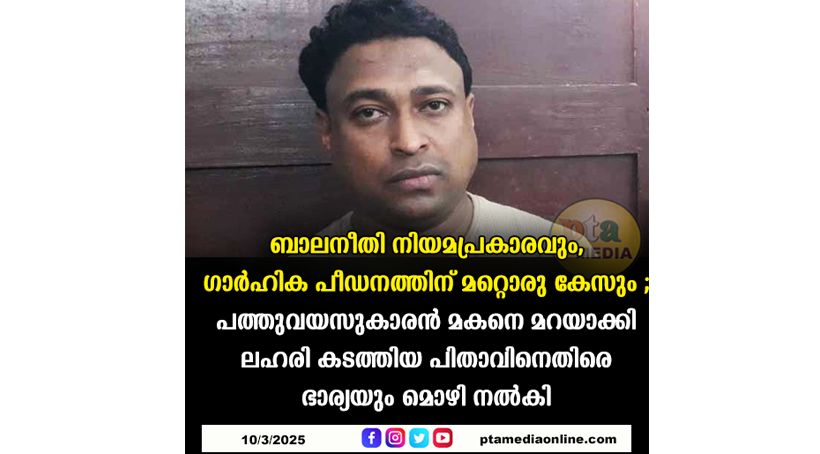 തിരുവല്ല: സ്വന്തം മകനായ പത്തു വയസുകാരനെ മറയാക്കി ലഹരി മരുന്ന് വ്യാപാരം നടത്തിയതിന് അറസ്റ്റിലായ പിതാവിനെതിരേ ബാലനീതി നിയമപ്രകാരവും കേസ് രജിസ്റ്റർ ചെയ്തു. ഇയാൾക്കെതിരേ ഭാര്യയുടെ പരാതിയിൽ ഗാർഹിക പീഡനത്തിന് കേസ് നിലവിലുണ്ട്. രഹസ്യ വിവരത്തെ തുടർന്ന് ഡാൻസാഫ് സംഘവും തിരുവല്ല പോലീസും ചേർന്ന് 3.78 ഗ്രാം എം ഡി എം എയുമായി പിടികൂടിയ കുറ്റപ്പുഴ ചുമത്ര കോവൂർ മലയിൽ വീട്ടിൽ മുഹമ്മദ് ഷമീറി(39)നെതിരെയാണ് മകനെ സംരക്ഷിക്കാത്തതിനു ബാലനീതി നിയമത്തിലെ വകുപ്പ് 78 പ്രകാരം ഭാര്യയുടെ മൊഴിവാങ്ങി കേസെടുത്തത്.