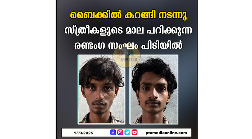 പത്തനംതിട്ട – കഞ്ചാവും, മറ്റു ലഹരി സാധനങ്ങളും വാങ്ങുന്നതിന് വേണ്ടി ബൈക്കിൽ കറങ്ങിനടന്ന് സ്ത്രീകളുടെ മാല പറിക്കുന്ന രണ്ടംഗ സംഘത്തെ കോന്നി പോലീസ് വിദഗ്ദ്ധമായി വലയിലാക്കി. ഇപ്പോൾ കുമ്പഴ തുണ്ടമൺകരയിൽ താമസിക്കുന്ന തണ്ണിത്തോട് മണ്ണീറ ചാങ്ങയിൽ കിഴക്കതിൽ വിമൽ സുരേഷ് (21), വടശ്ശേരിക്കര മനോരമ ജംഗ്ഷനിൽ മൗണ്ട് സിയോൺ സ്കൂളിന് സമീപം അരുവിക്കൽ ഹൗസിൽ സൂരജ് എം നായർ (21) എന്നിവരാണ് അറസ്റ്റിലായത്.
