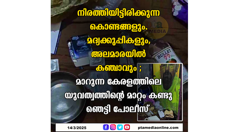 നിരത്തിയിട്ടിരിക്കുന്ന കൊണ്ടങ്ങളും. മദ്യക്കുപ്പികളും, അലമാരയിൽ കഞ്ചാവും ; മാറുന്ന കേരളത്തിലെ യുവത്വത്തിന്റെ മാറ്റം കണ്ടു ഞെട്ടി പോലീസ്