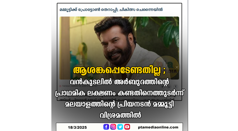 എന്നാൽ, സോഷ്യൽ മീഡിയയിൽ പ്രചരിക്കുന്നതുപോലെ യാതൊരുവിധ ആശങ്കയ്ക്കും അടിസ്ഥാനമില്ലെന്ന് മമ്മൂട്ടിയോട് അടുത്ത വൃത്തങ്ങൾ അറിയിച്ചു. നേരത്തേതന്നെ രോഗനിർണയം നടന്നതിനാൽ പ്രാഥമിക ചികിത്സകൊണ്ട് നടന് പൂർണ ആരോഗ്യവാനായി തിരിച്ചെത്താനാകുമെന്നാണ് പ്രതീക്ഷ. താരം ഇപ്പോൾ ചെന്നൈയിലെ വസതിയിലാണുള്ളത്. ഇവിടെനിന്നു ചെന്നൈയിലെ പ്രമുഖ ആശുപത്രിയിൽ നിത്യവും പോയി മടങ്ങത്തക്കവിധമാണു ചികിത്സ ക്രമീകരിച്ചിരിക്കുന്നത്. ഭാര്യ സുൽഫത്ത്, മകനും നടനുമായ ദുൽഖർ സൽമാൻ, ഭാര്യ അമൽ സൂഫിയ, മകൾ സുറുമി, മകളുടെ ഭർത്താവ് ഡോ. മുഹമ്മദ് റെഹാൻ സയിദ് എന്നിവരും മമ്മൂട്ടിക്കൊപ്പമുണ്ടെന്നും ദീപിക പറയുന്നു. മഹേഷ് നാരായണൻ സംവിധാനം ചെയ്യുന്ന ബിഗ് ബജറ്റ് ചിത്രത്തിൽ അഭിനയിച്ചുവരികയായിരുന്നു മമ്മൂട്ടി. മോഹൻലാലും ഫഹദ് ഫാസിലും കുഞ്ചാക്കോ ബോബനും നയൻതാരയുമുൾപ്പെടെ വൻ താരനിര അണിനിരക്കുന്ന ചിത്രമാണിത്. ഇതിന്റെ ചിത്രീകരണത്തിൽനിന്ന് ഇടവേളയെടുത്താണ് ചികിത്സ. പ്രോട്ടോൺ തെറാപ്പി കഴിഞ്ഞ് സിനിമയുടെ ചിത്രീകരണം പൂർത്തിയാക്കാനാണ് ഇപ്പോൾ ഉദ്ദേശിക്കുന്നതെന്നും ദീപിക പറയുന്നു.