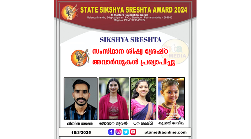 അടുത്ത വർഷത്തേക്കുള്ള സംസ്ഥാന ശിഷ്യ ശ്രേഷ്ഠ അവാർഡിന്റെ അപേക്ഷയ്ക്കും,വിശദവിവരങ്ങൾക്കും 9048685287 എന്ന നമ്പറിൽ വിളിയ്ക്കുക.