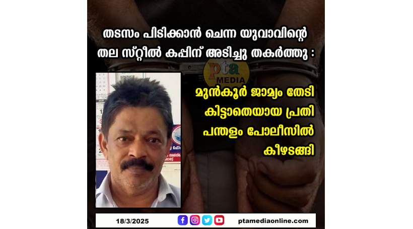 ആശുപത്രിയില് നിന്നുള്ള വിവരത്തിന്റെ അടിസ്ഥാനത്തില് പോലീസ് ഇന്സ്പെക്ടര് ടി ഡി പ്രജീഷിന്റെ നിര്ദ്ദേശപ്രകാരം, എസ് സി പി ഓ സോളമന് ഡേവിഡ് മൊഴി രേഖപ്പെടുത്തി. തുടര്ന്ന് എസ് ഐ അനീഷ് എബ്രഹാം കേസ് രജിസ്റ്റര് ചെയ്ത് അന്വേഷണം ആരംഭിച്ചു. കേസെടുത്തതിനെതുടര്ന്ന് ഒളിവില് പോയ പ്രതി, പത്തനംതിട്ട സെഷന്സ് കോടതിയില് മുന്കൂര് ജാമ്യത്തിന് ശ്രമിച്ചുവെങ്കിലും ലഭിച്ചില്ല. പിന്നീട് ഹൈക്കോടതിയെ സമീപിക്കുകയായിരുന്നു. ഹൈക്കോടതി ഉത്തരവുപ്രകാരം ഇന്ന് സ്റ്റേഷനില് ഹാജരായ പ്രതിയെ സാക്ഷികളെ കാണിച്ചു തിരിച്ചറിയുകയും, വൈദ്യപരിശോധന ഉള്പ്പെടെയുള്ള നടപടികള്ക്കും ശേഷം അറസ്റ്റ് രേഖപ്പെടുത്തി. ഇയാള് കുറ്റസമ്മതമൊഴിയില് പറഞ്ഞ അടിക്കാന് ഉപയോഗിച്ച സ്റ്റീല് കപ്പ് പോലീസ് കണ്ടെടുത്തു. കോടതിയില് ഹാജരാക്കിയ പ്രതിയെ പിന്നീട് റിമാന്ഡ് ചെയ്തു.