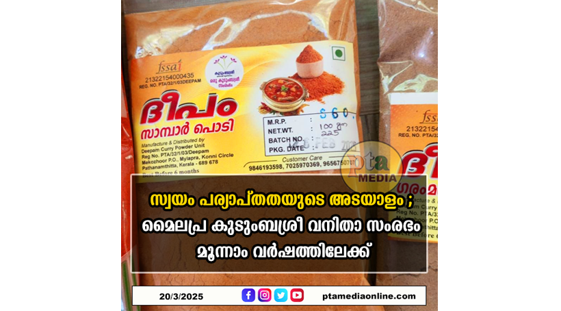 പത്തനംതിട്ട – ജില്ലയുടെ സംരംഭക അധ്യായത്തിൽ സ്വയംപര്യാപ്തതയുടെ അടയാളവുമായി മൈലപ്ര കുടുംബശ്രീ. കുടംബശ്രീയിലെ അഞ്ചു വനിതകൾ ചേർന്ന് ‘ദീപം’ എന്ന പേരിൽ കറിപൊടികൾ നിർമിച്ച് വരുമാനം കണ്ടെത്തുന്നു. കുടുംബശ്രീയുടെ വ്യവസായിക പദ്ധതിയിൽ നിന്നും ലഭിച്ച നാല് ലക്ഷം രൂപയുമായി 2022 ലാണ് ദീപം കറിപൊടി പ്രവർത്തനം ആരംഭിച്ചത്. ഗീത മുരളി, രാജി വിൽസൺ , പി ആർ രജനി, അഞ്ജു വിജയൻ , രമാ മുരളി എന്നിവരാണ് നടത്തിപ്പുകാർ. മൈലപ്ര പേഴുംകാടാണ് സ്ഥാപനം.