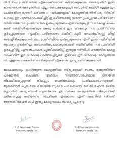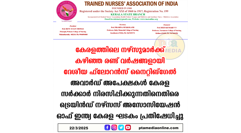 ലോകമെമ്പാടും വാഴ്ത്തുന്ന കേരളത്തിലെ നഴ്സുമാർക്ക് സ്വന്തം രാജ്യത്തിന്റെ പരമോന്നത ബഹുമതി ഇത്രയും നിരുത്തരവാദപരമായ രീതിയിൽ നിഷേധിക്കപ്പെടുന്നത് തികച്ചും വേദനജനകവും പ്രതിഷേധാർഹവുമാണ്.. ആയതിനാൽ കൃത്യമായ രീതിയിൽ സൂക്ഷ്മ പരിശോധനാ സമിതി ചേർന്ന് ദേശീയ ഫ്ലോറൻസ് നൈറ്റിങ്ഗേൽ പുരസ്കാരം ഈ വർഷം കേരളത്തിലെ നഴ്സുമാർക്ക് ലഭിക്കാനുള്ള അടിയന്തിര നടപടികൾ എടുക്കണം എന്ന് ട്രെയിൻഡ് നഴ്സസ് അസോസിയേഷൻ ഓഫ് ഇന്ത്യ കേരള ഘടകം ആവശ്യപ്പെടുന്നു.